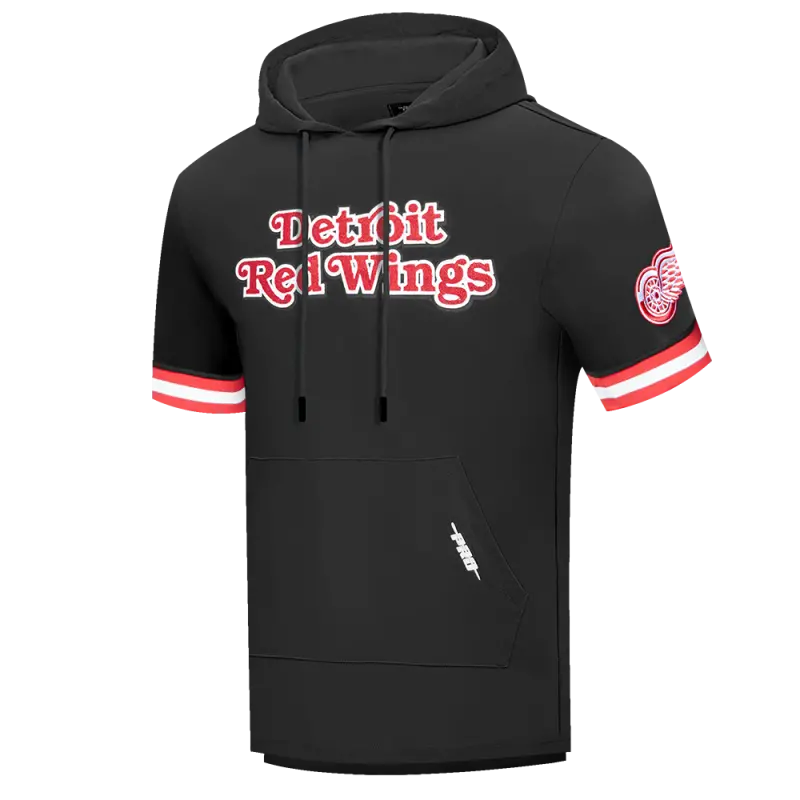 NHL DETROIT RED WINGS CLASSIC CHENILLE MEN’S DOUBLE KNIT SHORT SLEEVE PULLOVER HOODIE (BLACK\/RED)