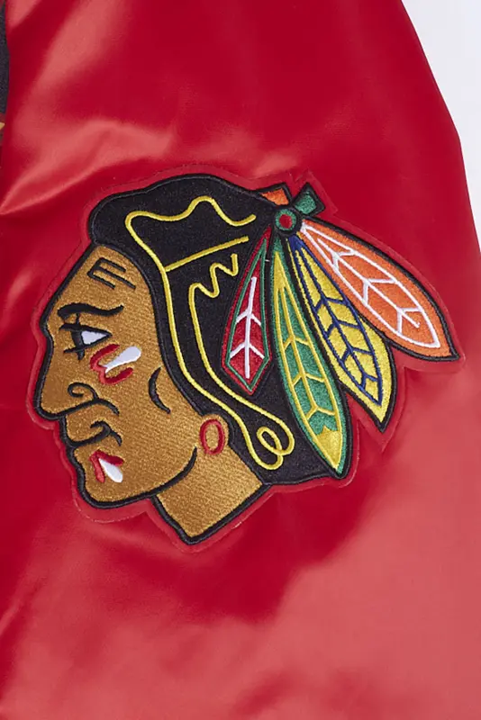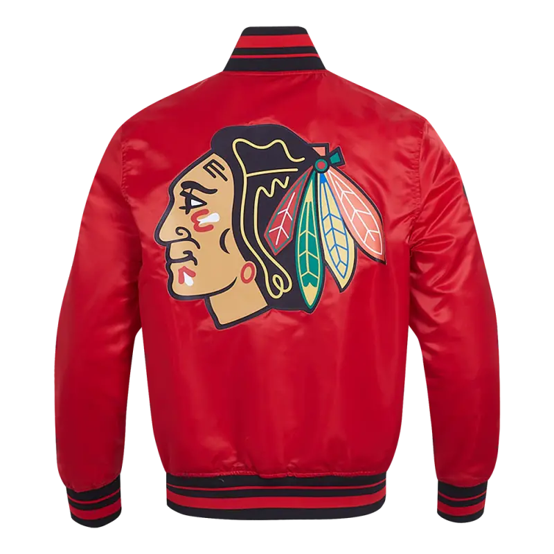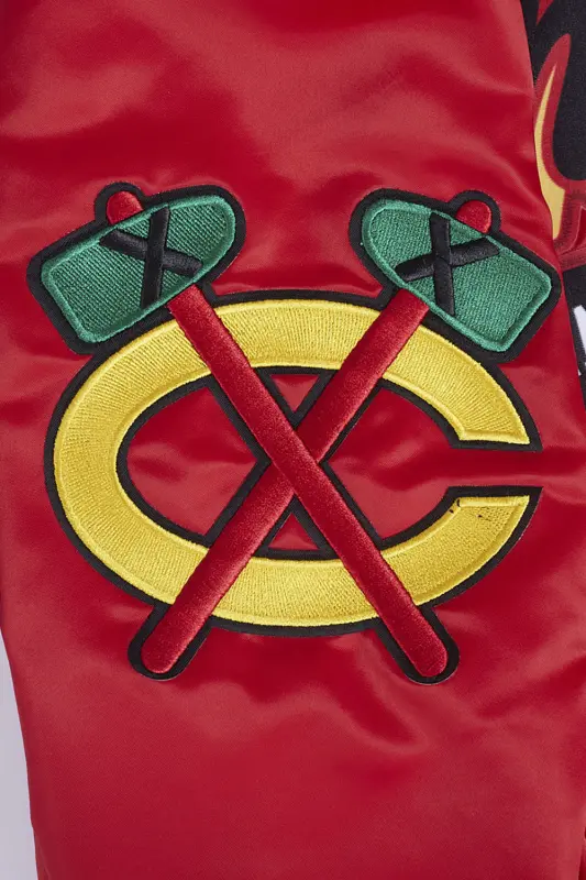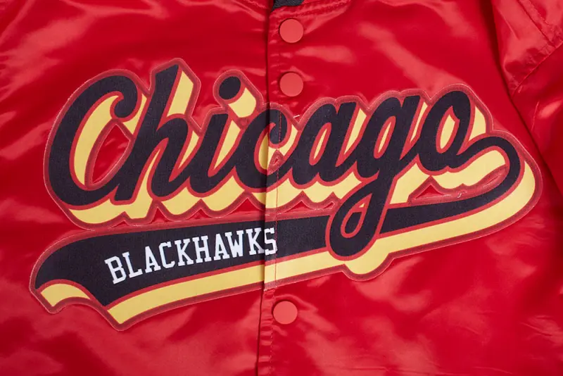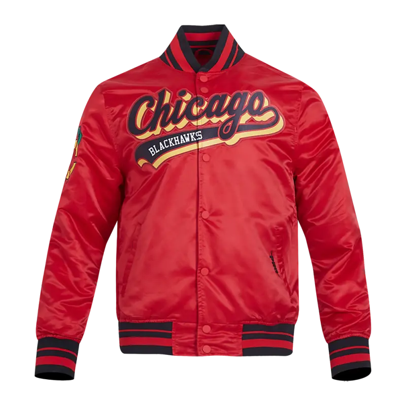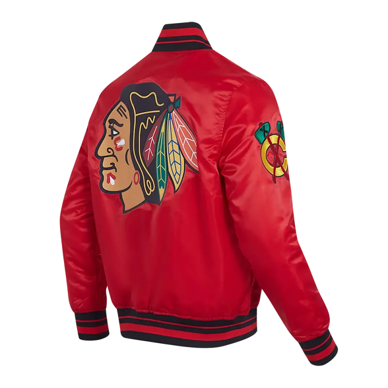 NHL CHICAGO BLACKHAWKS SCRIPT TAIL MEN’S RIB SATIN JACKET (RED\/BLACK)