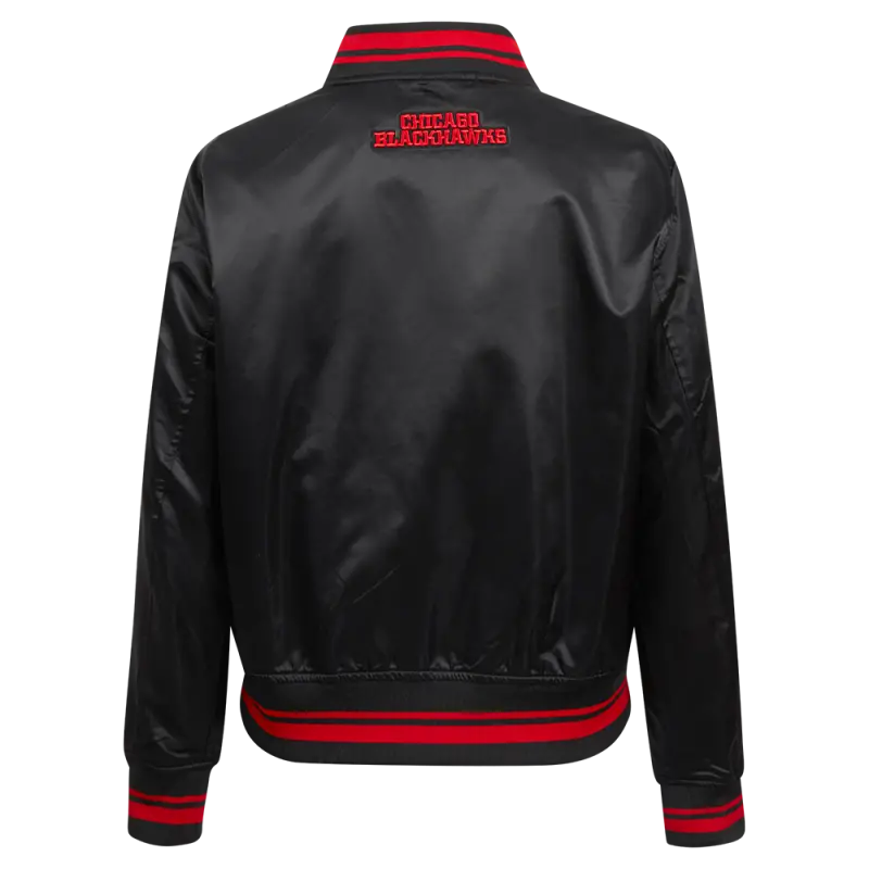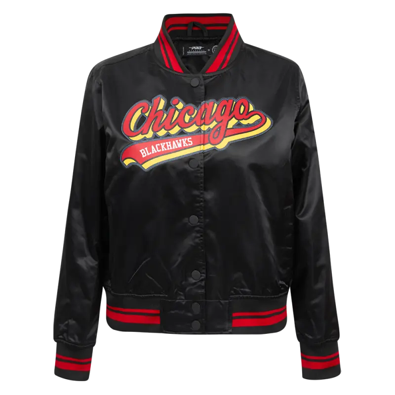 NHL CHICAGO BLACKHAWKS SCRIPT TAIL WOMEN’S SATIN JACKET (BLACK\/RED\/BLACK)
